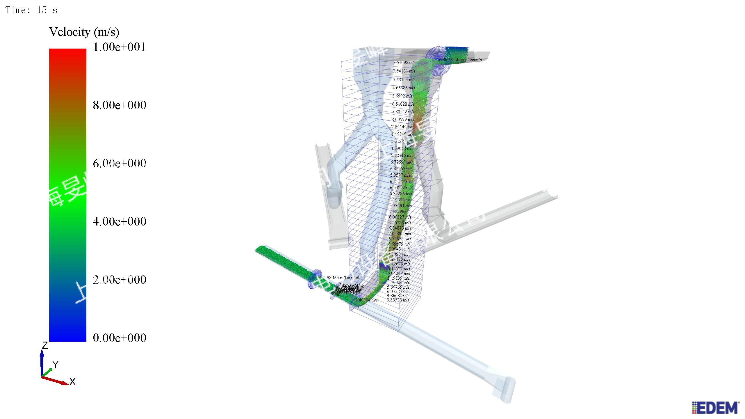 曲线落煤管技术是利用DEMSolutions公司离散元软件(EDEM BulkSim),研究物料粒子的弹性、黏性、塑性、形变等级、滑动、膨胀和流动性,在此分析基础上建立数学模型,结合计算机仿真技术,将原来的煤降落过程转变为煤滑落过程;控制煤流在滑落过程中的动势能大小和方向的转变,使其严格按照切向角度和速度滑落;使煤流束的出口水平速度与接煤皮带速度匹配一致,使煤流束能够平缓的滑落到接料皮带上。