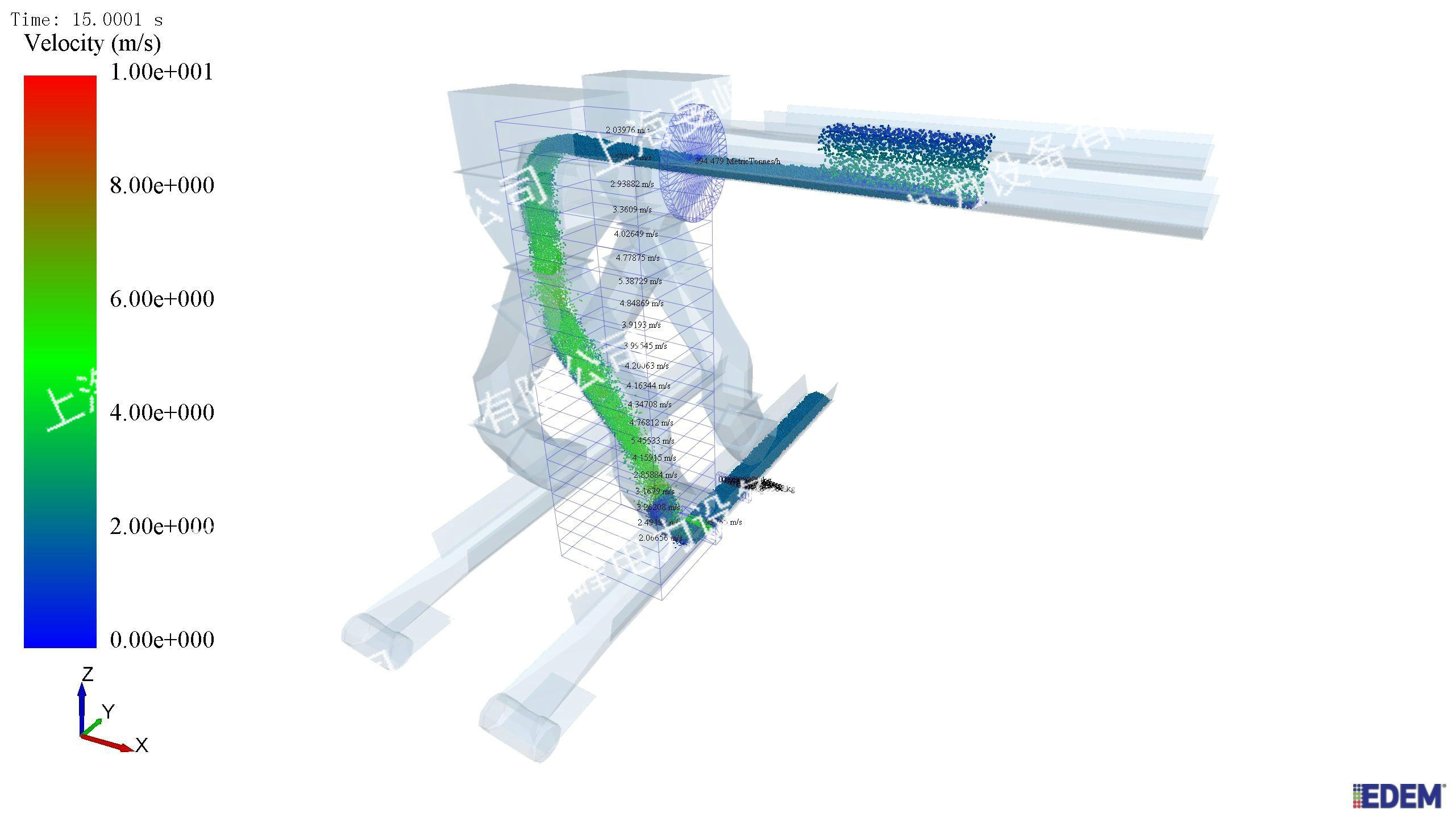 曲线落煤管技术是利用DEMSolutions公司离散元软件(EDEM BulkSim),研究物料粒子的弹性、黏性、塑性、形变等级、滑动、膨胀和流动性,在此分析基础上建立数学模型,结合计算机仿真技术,将原来的煤降落过程转变为煤滑落过程;控制煤流在滑落过程中的动势能大小和方向的转变,使其严格按照切向角度和速度滑落;使煤流束的出口水平速度与接煤皮带速度匹配一致,使煤流束能够平缓的滑落到接料皮带上。